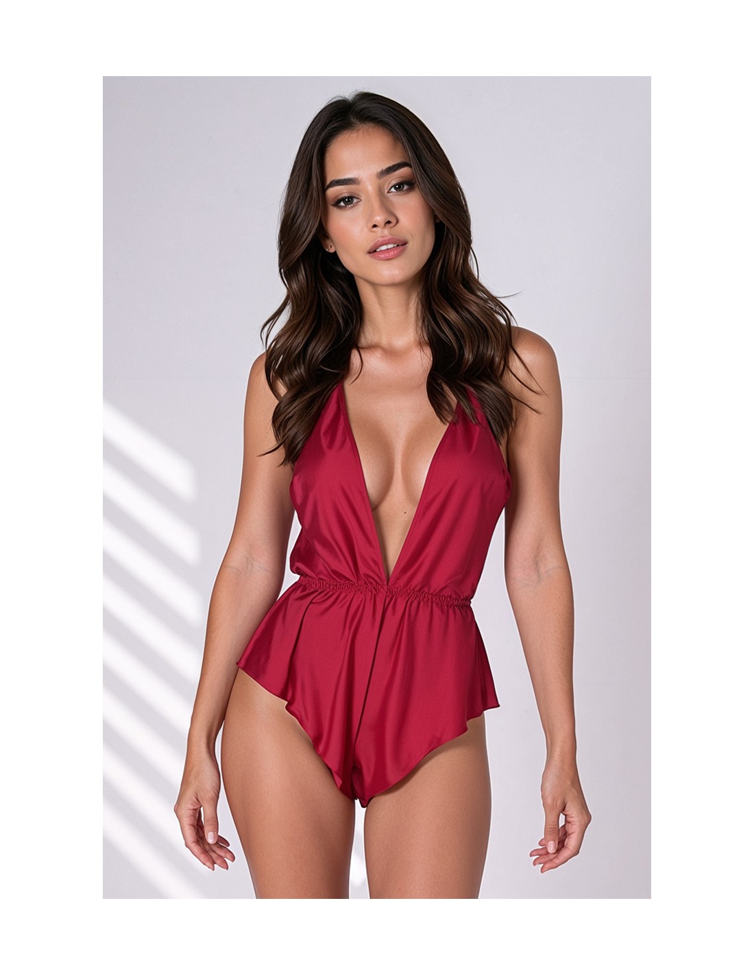 Ce super body en tissu satiné bordeaux semble fabriqué de deux pièces, avec un bustier qui laisse un décolleté très plongeant mais aussi un short large qui remonte sur les hanches. Mais il sagit bien dun body et les deux pièces sont solidaires. Elles sont dailleurs matérialisées par une ceinture froncée au niveau de la taille qui rajoute une touche délégance.