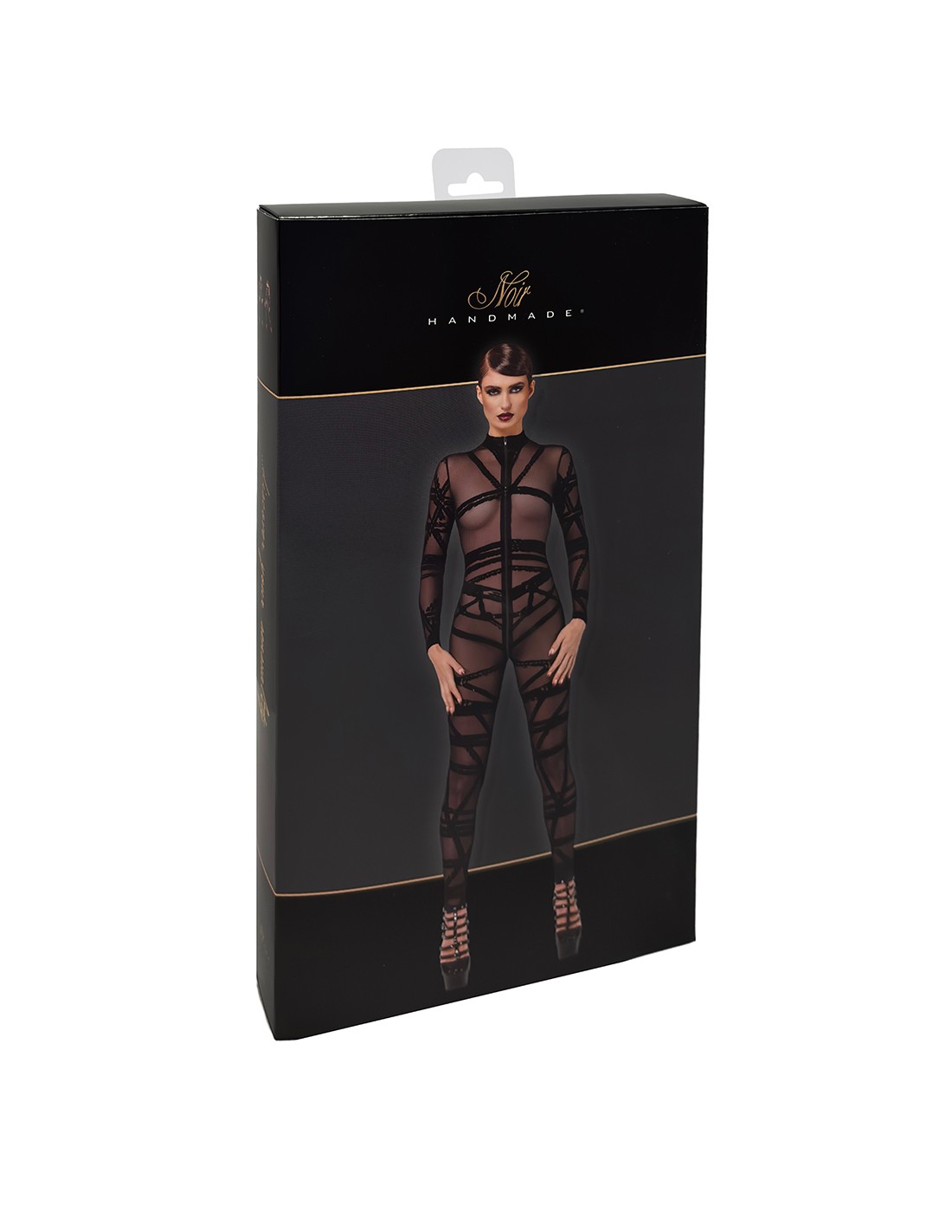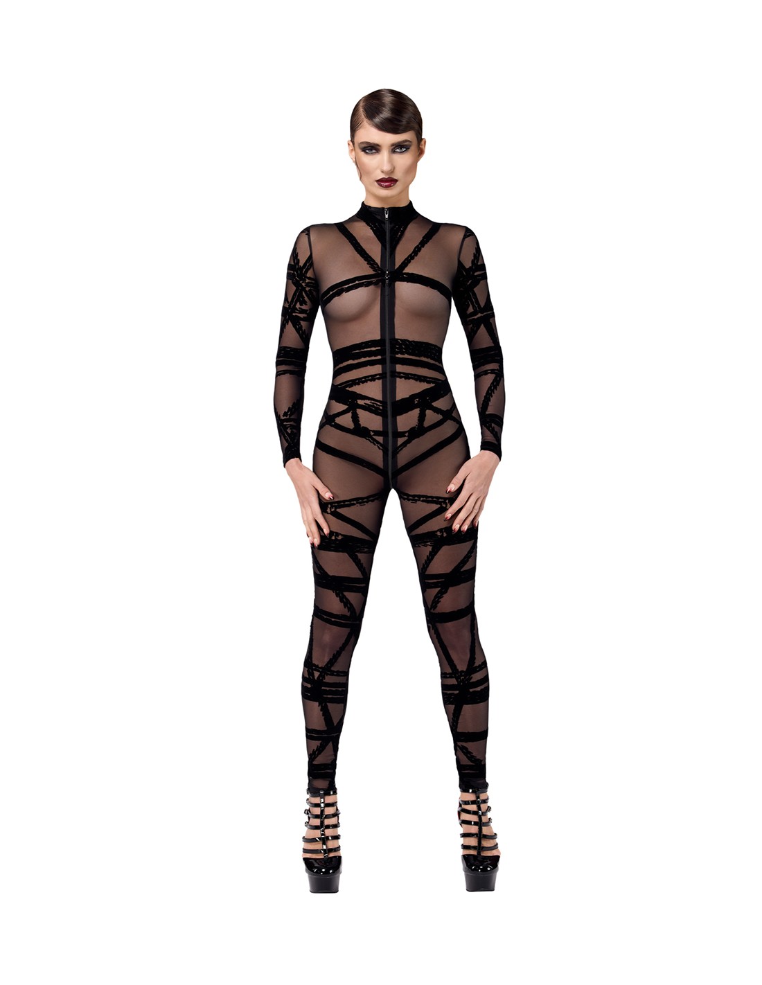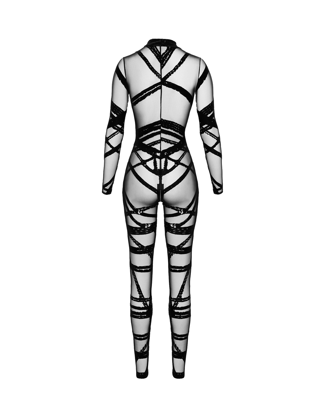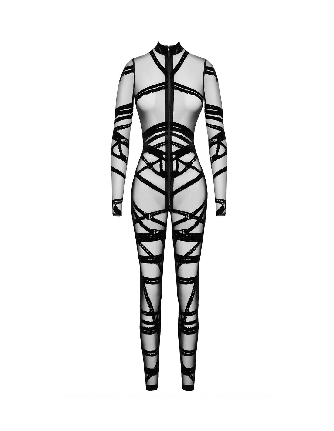 Combinaison noire, semi-transparente, en tulle extensible floqué style bondage.