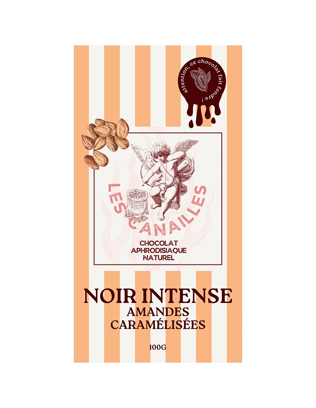 Chocolat aphrodisiaque naturel noir intense et amandes caramélisées, fabrication artisanale française.