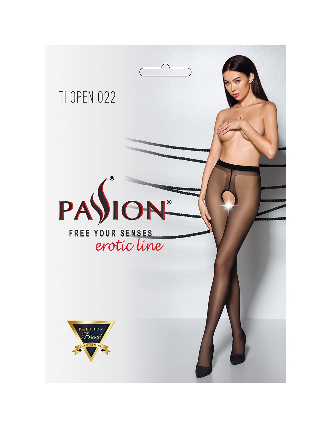 Ces collants noirs parfaitement unis jouent de face la carte de la sobriété tout en exhibant l'ouverture intime qui dévoile le trésor de l'entre-jambe.