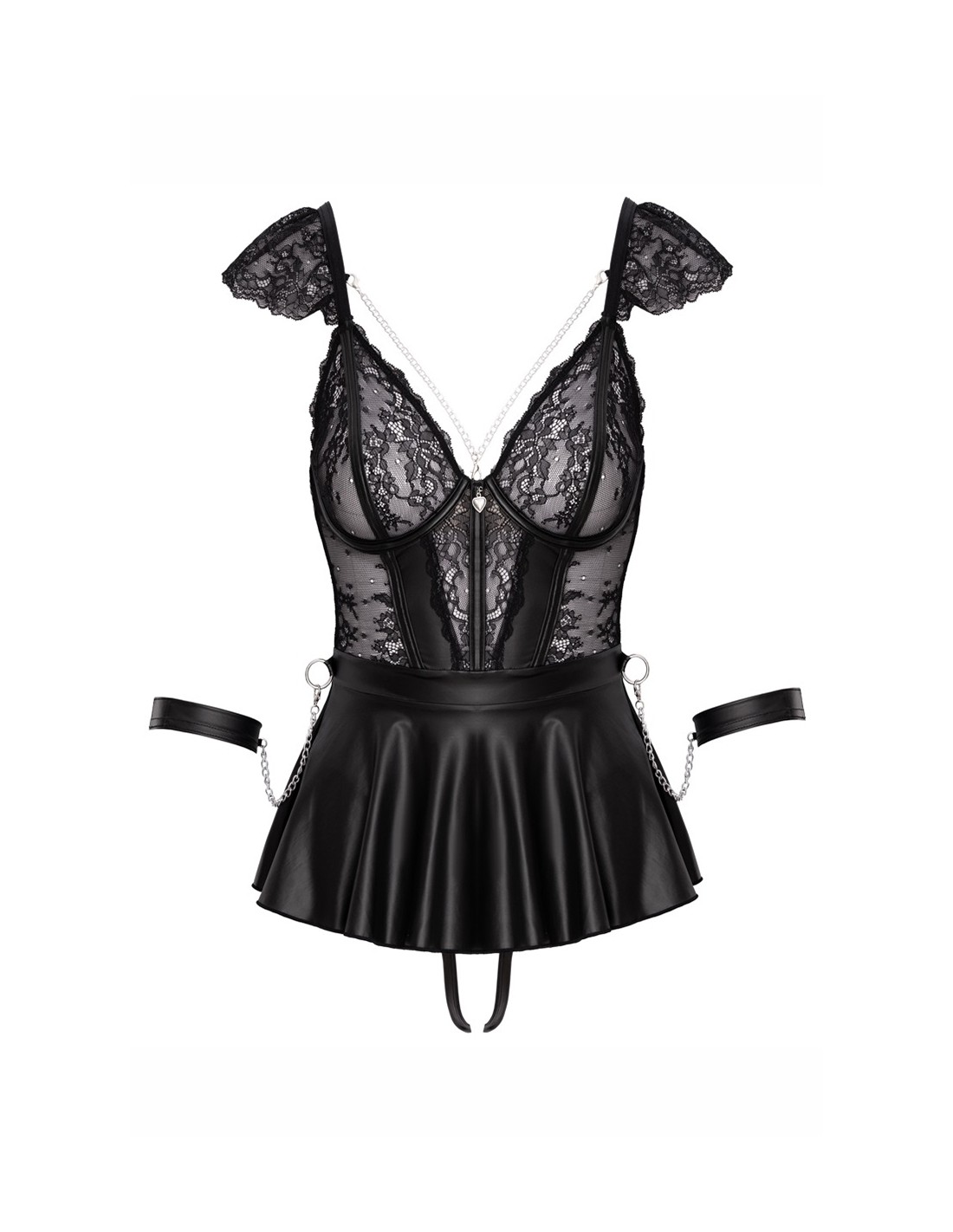 La jupe évasée à l'allure mate est dotée d'anneaux à la taille, prêts à accueillir les menottes douces incluses. Celles-ci, avec leurs chaînes à mousquetons, vous invitent à explorer de nouvelles sensations.