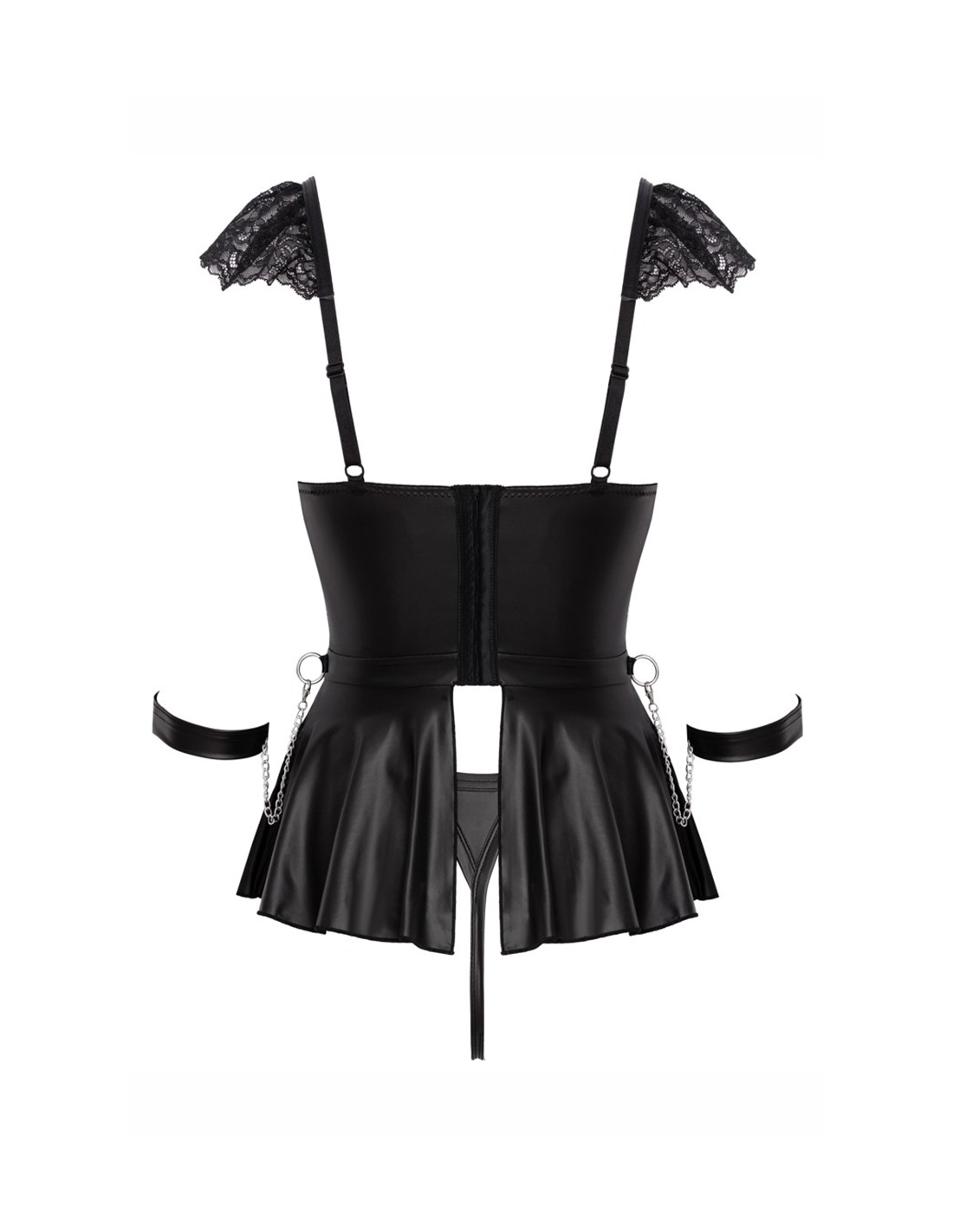 ensemble de lingerie 3 pièces style bondage avec Babydoll, string ouvert et menottes souples.