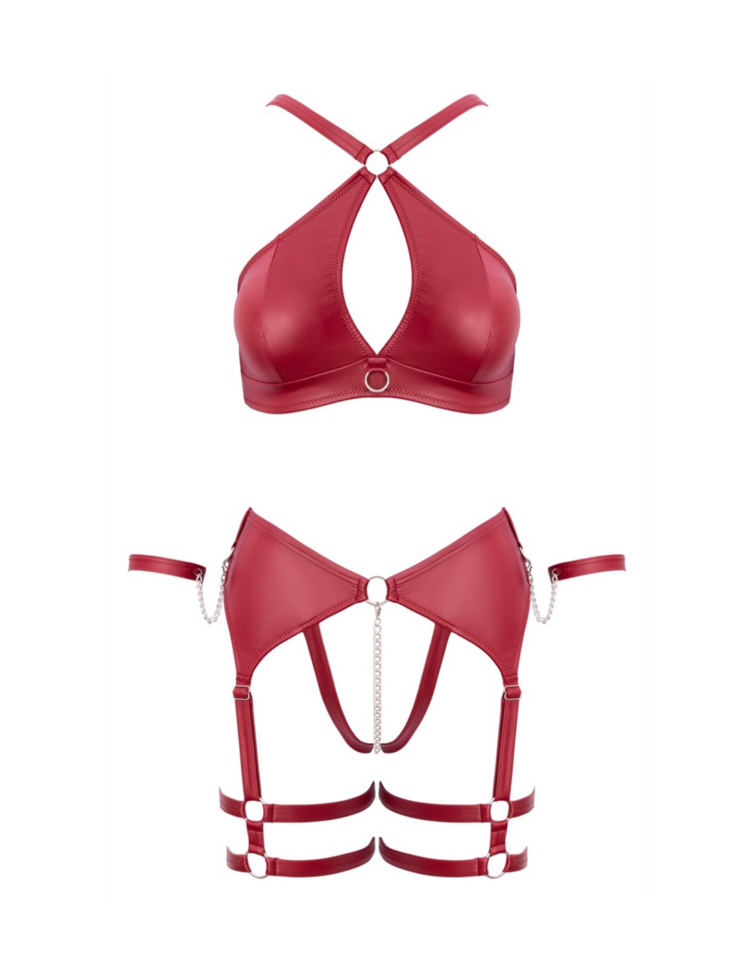 Cet ensemble de lingerie signé Cottelli BONDAGE se pare d'un magnifique rouge foncé mat, rehaussé d'accessoires argentés. Il est composé d'un soutien-gorge souple, d'un string ouvert avec porte-jarretelles et de menottes souples. Conçu dans une matière douce et entièrement élastique, il offre un confort absolu tout en sublimant votre silhouette.