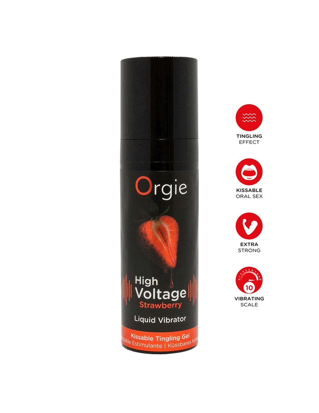 "High Voltage Strawberry Liquid Vibrator" est le gel intime d'excitation extra fort pour couples de la marque de cosmétique érotique Orgie. Il est recommandé pour le sexe oral car il est parfumé à la fraise et embrassable.