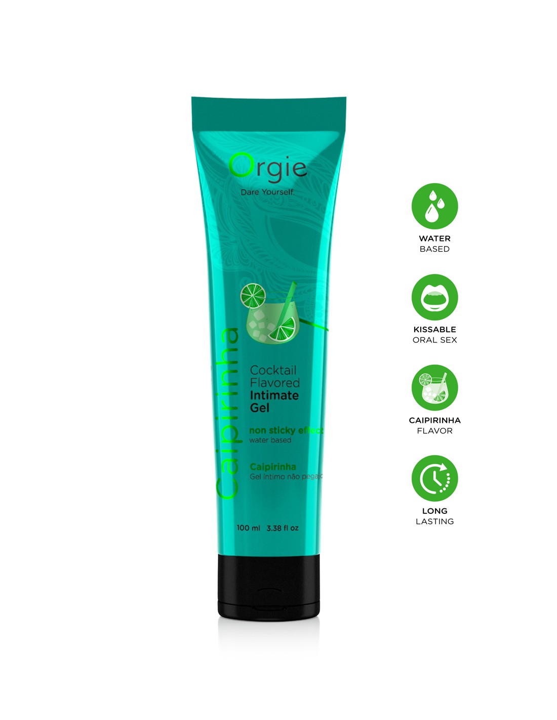 Gel intime Orgie à base deau, embrassable, longue durée, au goût de Caipirinha, en tube de 100ml.
