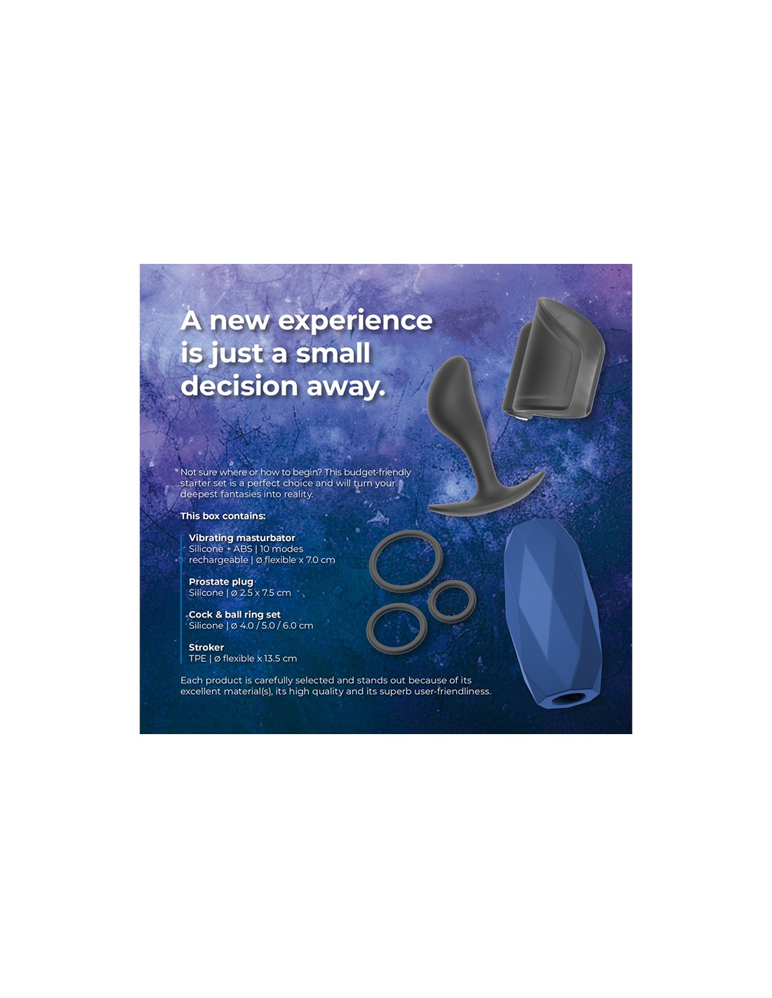 Le coffret 4 sextoys pour stimuler le plaisir masculin : 1 vibromasseur, 1 masturbateur, 1 plug anal et 3 cockrings.