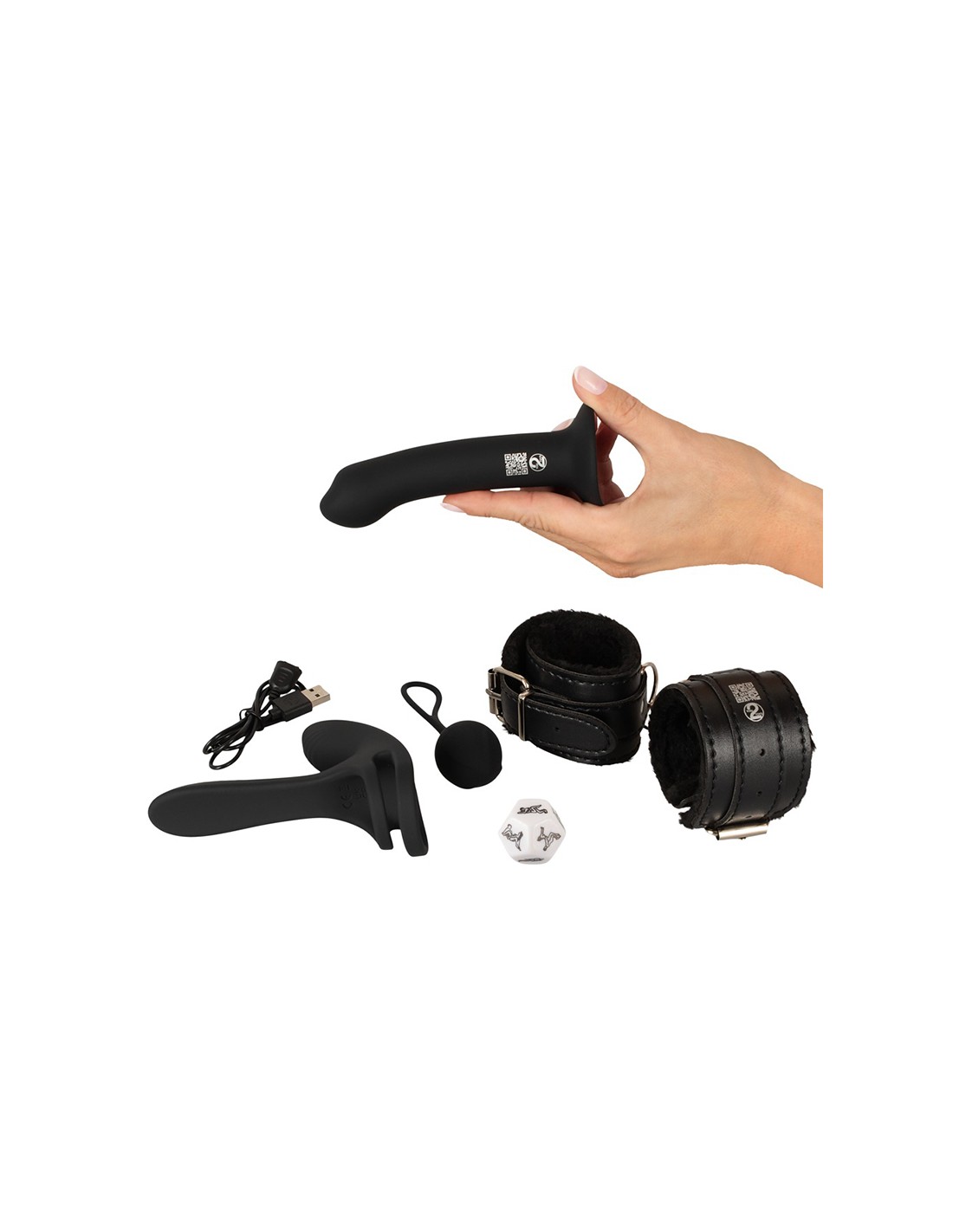 Coffret 5 sextoys pour booster le plaisir en couple : 1 stimulateur spécial couple, 1 godemiché, 1 plug anal, 1 paire de menottes, 1 boule de Geisha et 1 dé 12 positions sexuelles.