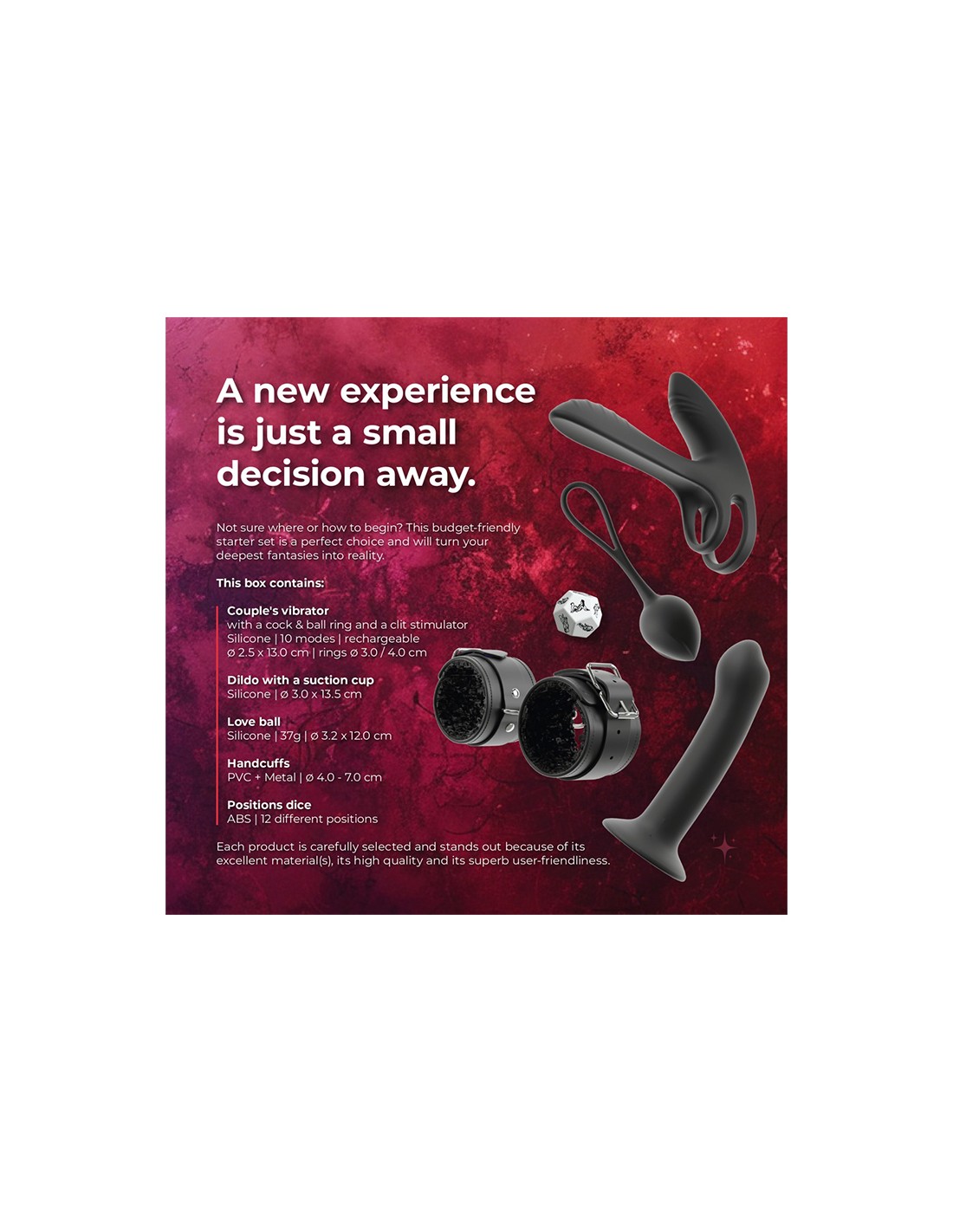 Le Couples Love Toy Starter Set Together exclusif de Magic Shiver avec 5 sextoys de qualité supérieure rigoureusement sélectionnés inspire les couples à de nouvelles aventures intimes. 3 jouets raffinés en silicone, des menottes souples et un dé d'amour invitent à expérimenter le plaisir et à atteindre des orgasmes intenses. Ces jouets intimes faciles à utiliser sont optimaux pour une entrée ludique dans le monde des sextoys.