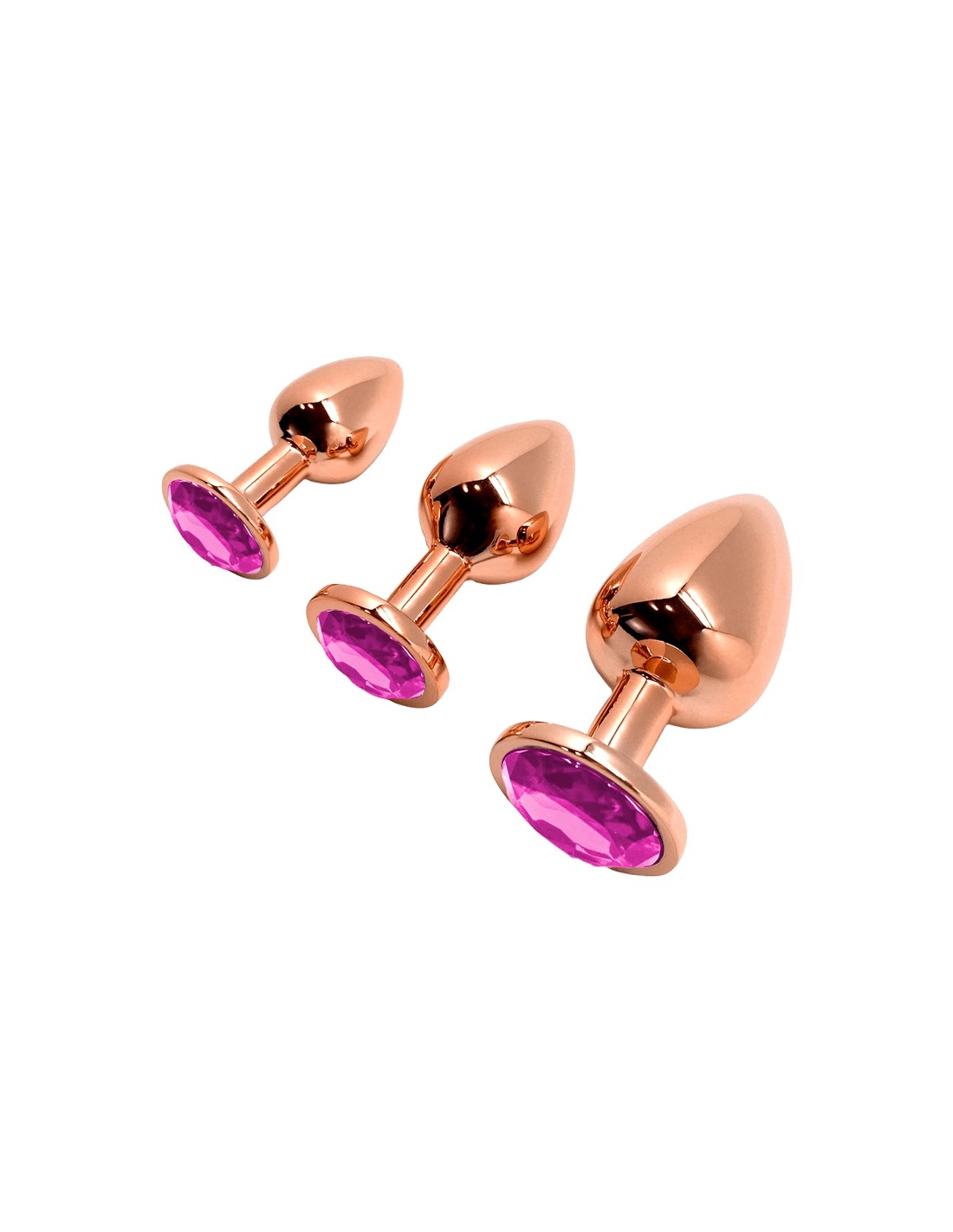 Plug anal en métal couleur rose gold dune longueur de 8 cm et dun diamètre de 3,4 cm, décoré dun bijou rose à sa base.