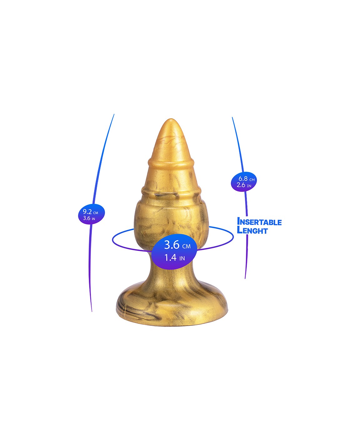 Plug anal premium en silicone liquide, forme ergonomique, couleur dorée, thermo réactif, dimensions 9,2 x 3,6 cm.