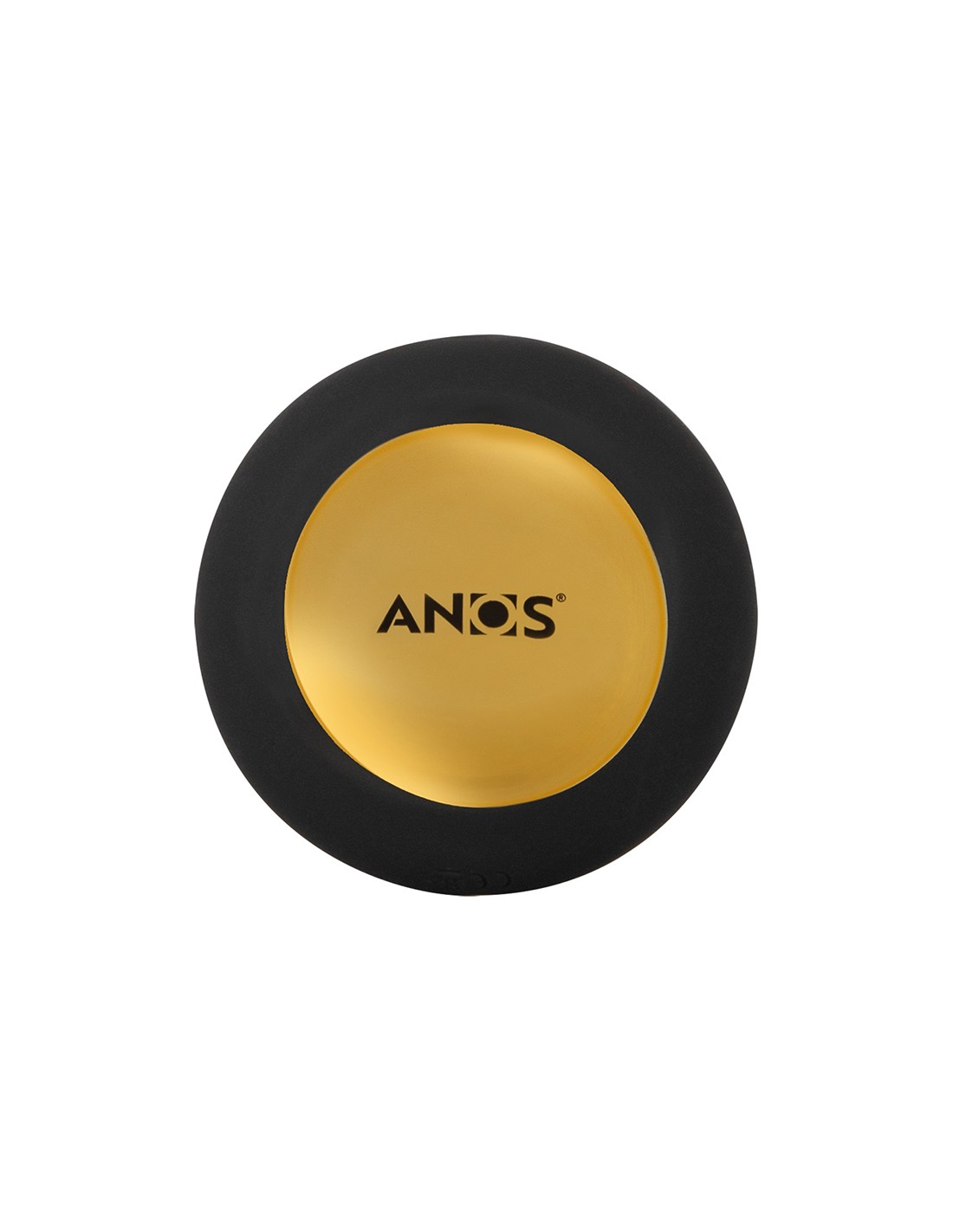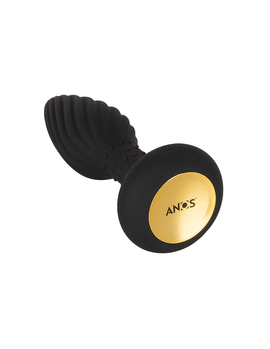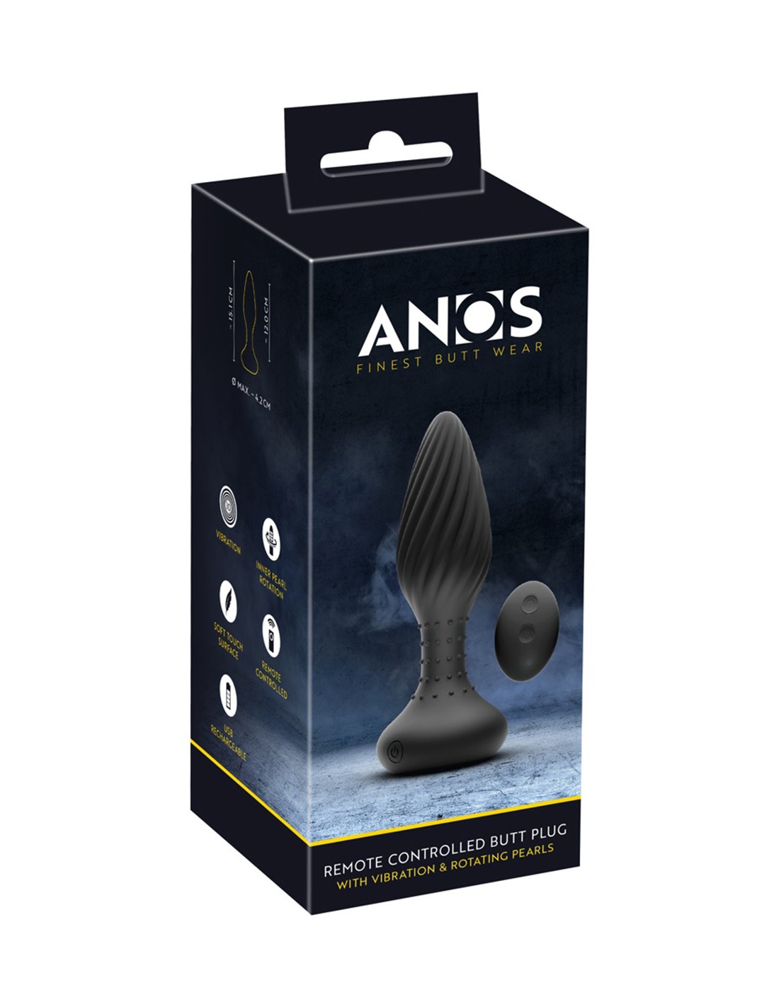 Le "Remote Controlled Butt Plug with Vibration & rotating pearls" d'ANOS est un plug anal vibrant avec un design en spirale distinctif pour un massage anal intensif. Les boules de massage rotatives dans la partie basse du plug stimulent l'anus de manière ciblée. Sous la base, un petit miroir rond, de couleur dorée, décore l'anus lorsque le plug est porté.