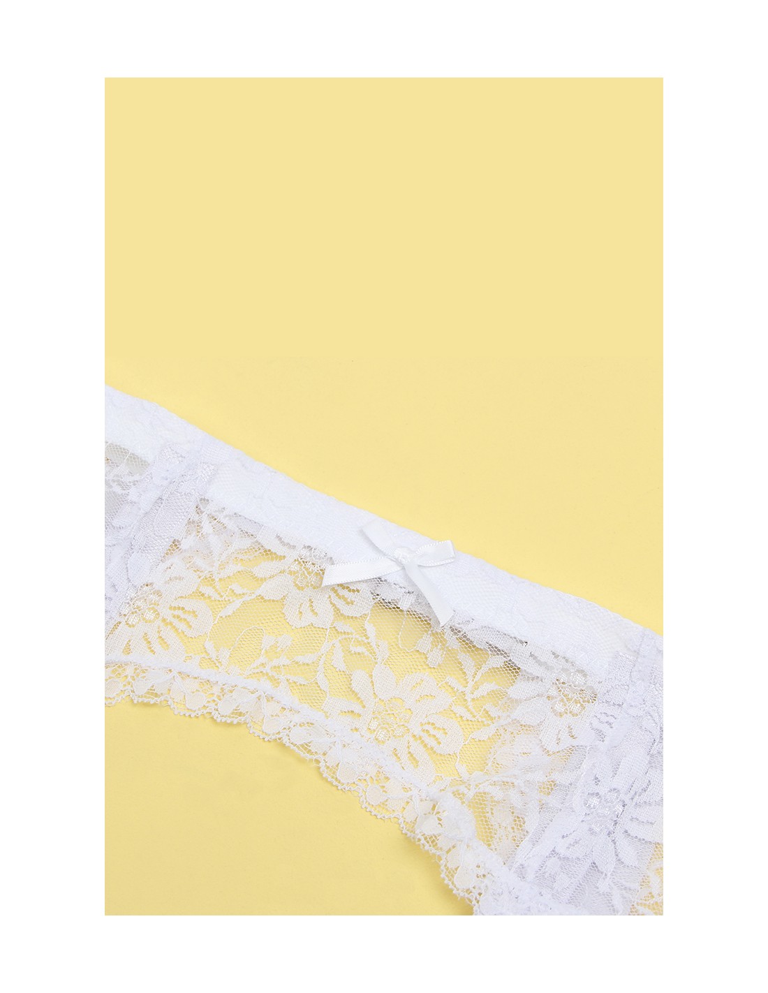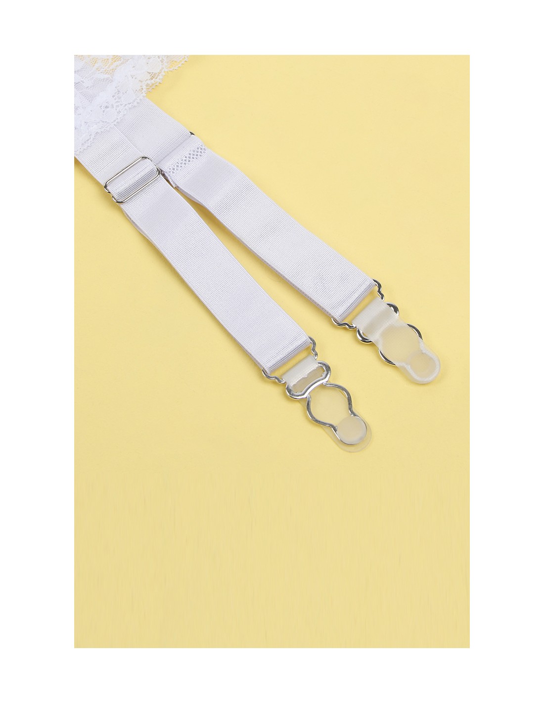 Ensemble porte-jarretelles et string blanc en dentelle résille avec ceinture ajustable et quatre jarretelles.