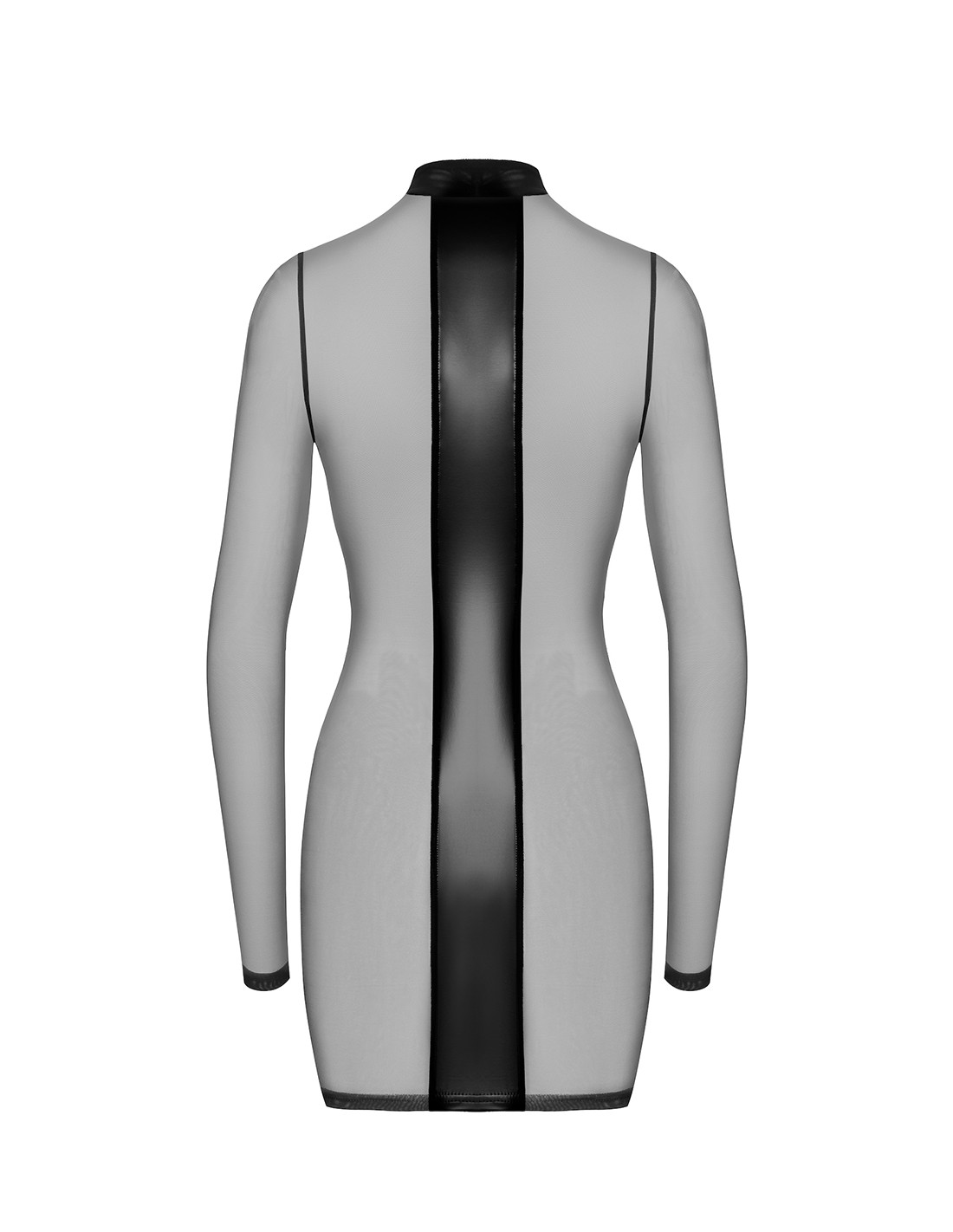 robe noire courte et moulante, conçue en powerwetlook et tulle extensibles.