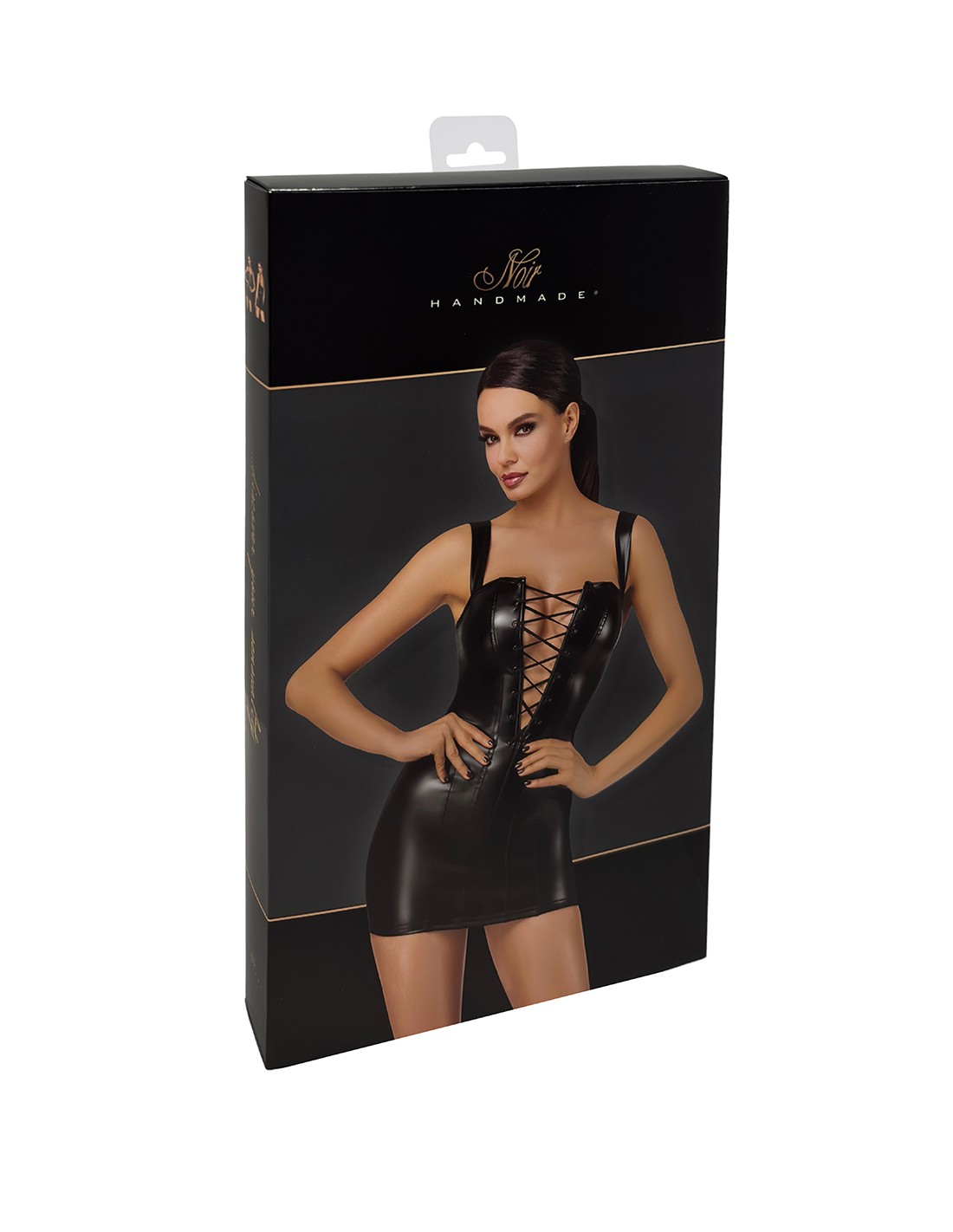 Mini robe noire moulante et élastique à effet wetlook, avec décolleté plongeant à lacets devant.