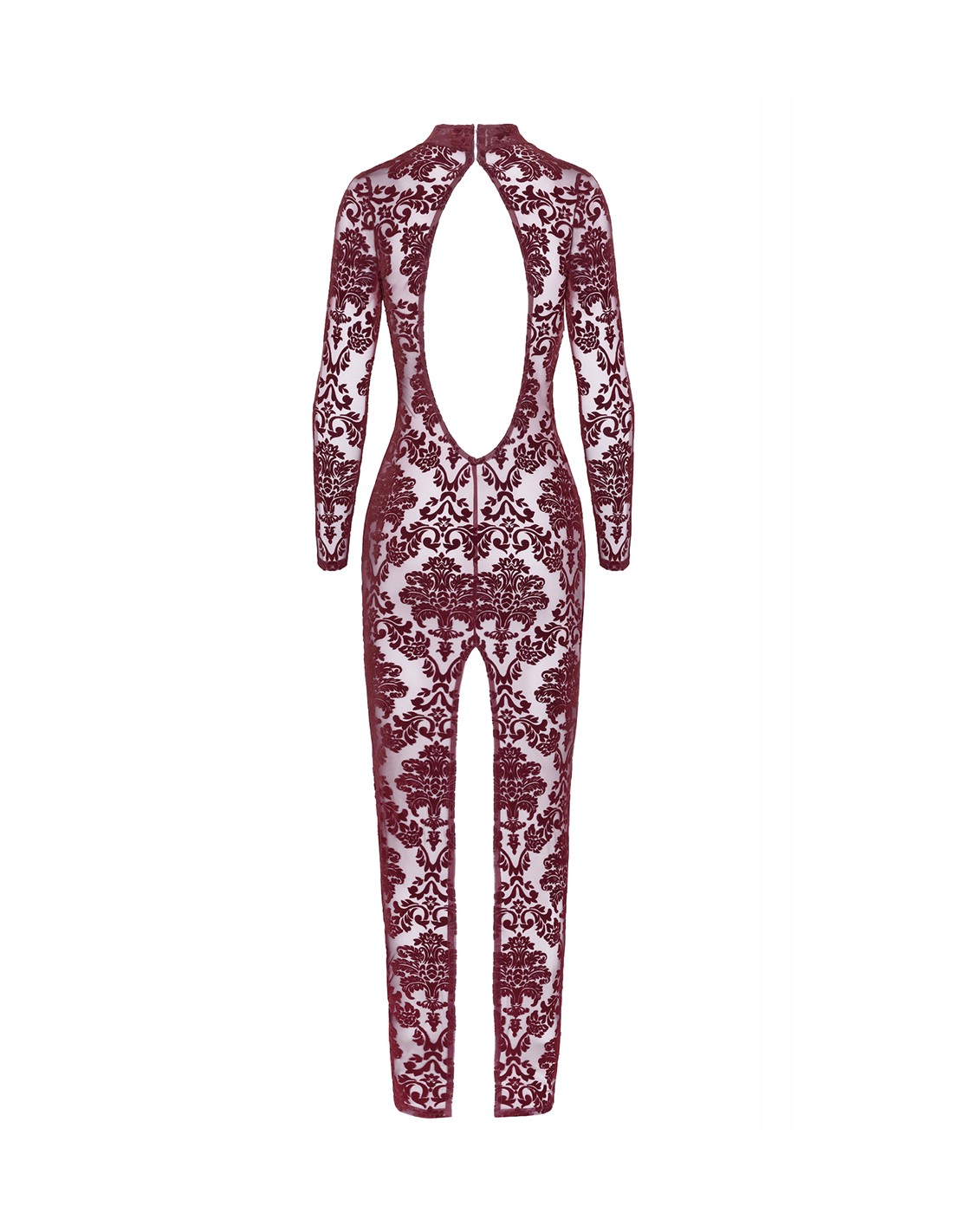 Luxueuse robe longue dos nu à manches longues fabriquée en tulle transparente bordeaux.