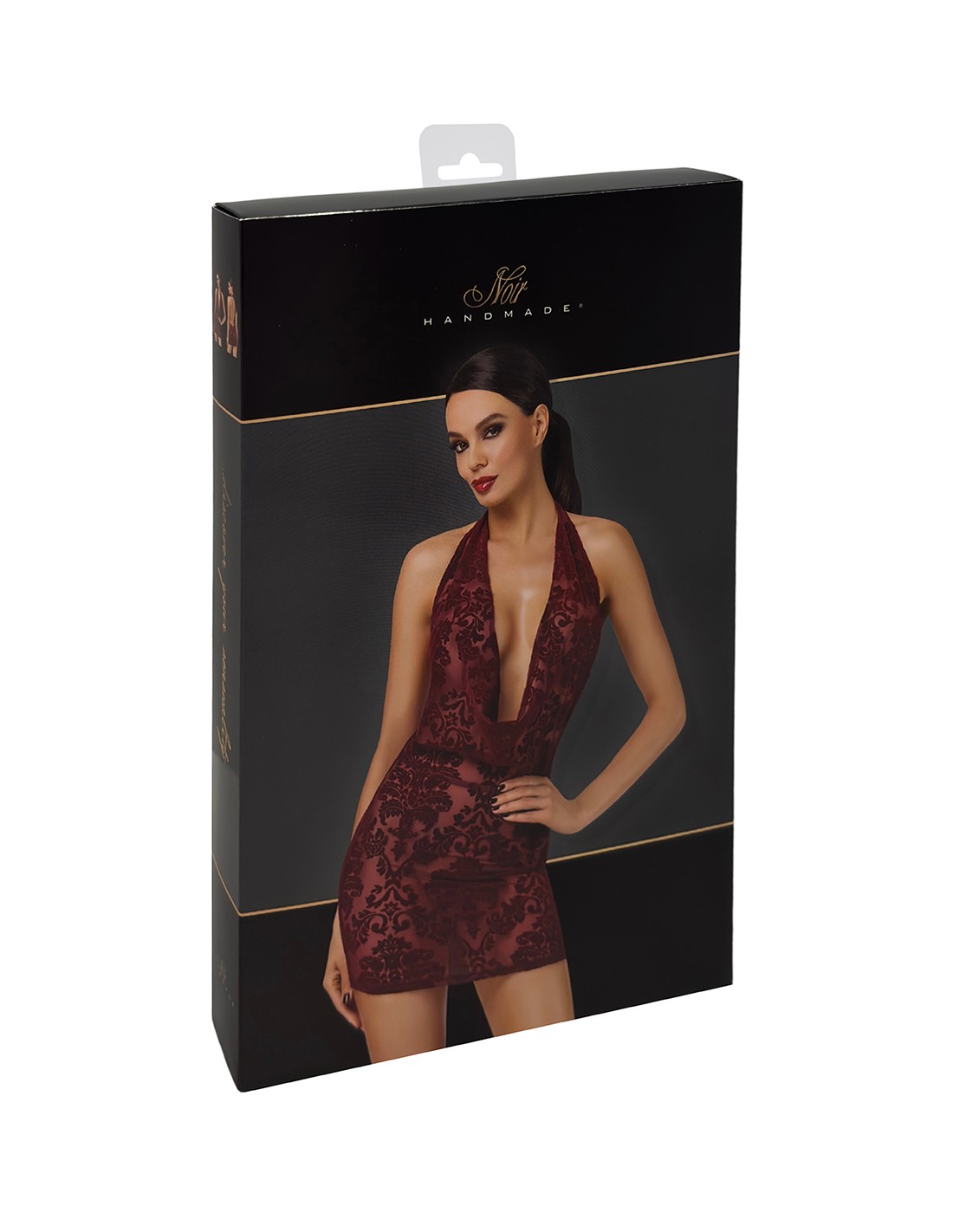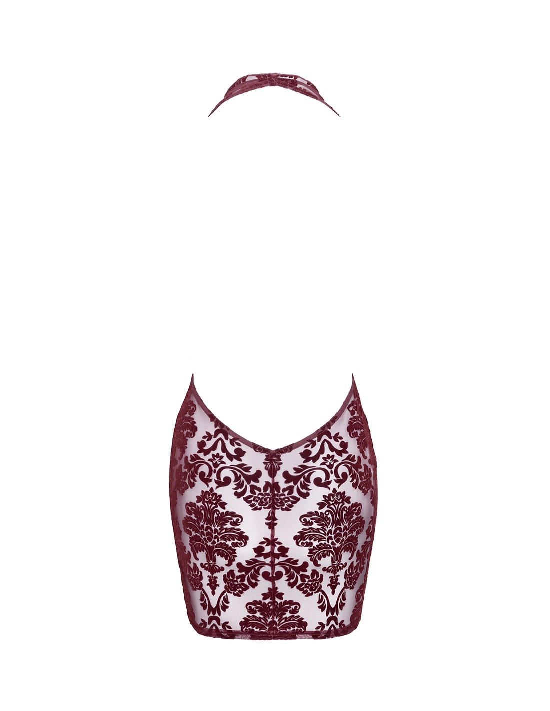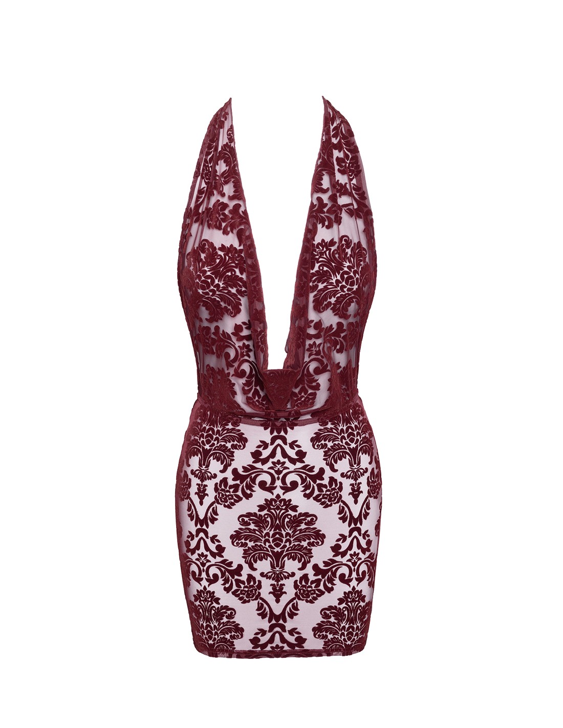Une audacieuse robe courte, dos nu en luxueux tulle floqué bordeaux transparent.