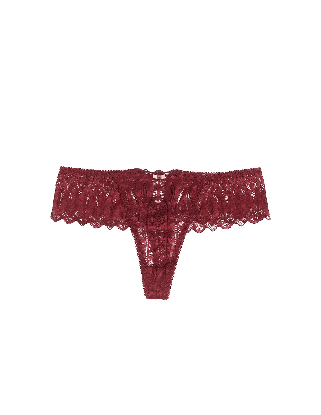 String bordeaux en dentelle semi-transparente avec dos lacé croisé et gousset coton pour une lingerie élégante, sexy et confortable.