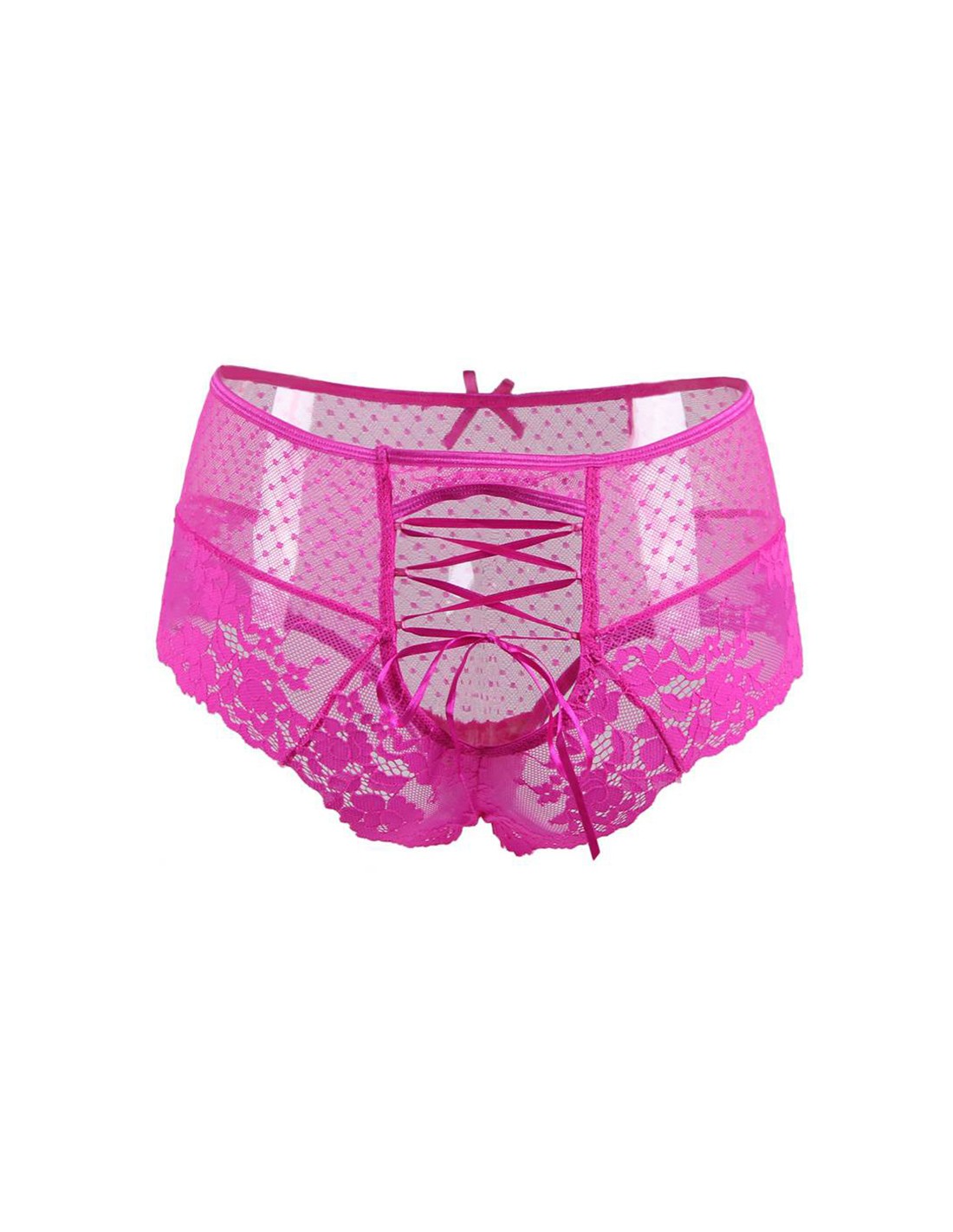 Tanga taille haute rose en dentelle avec laçage réglable au dos et ceinture élastique, pour une lingerie élégante, confortable et flatteuse.