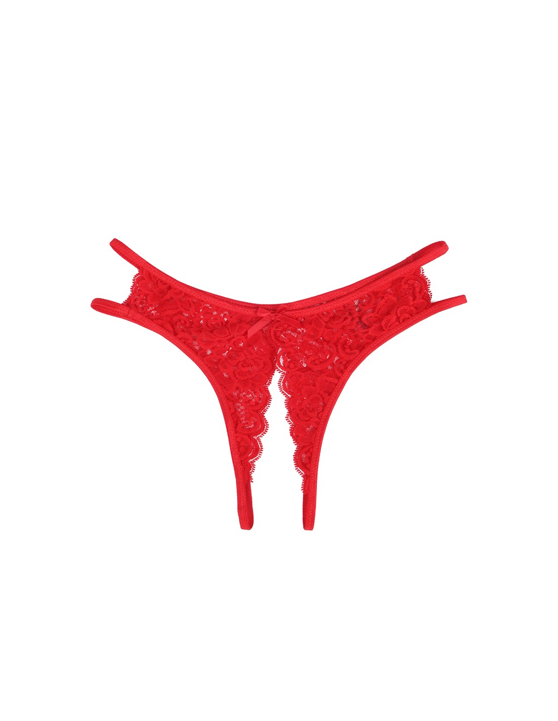 String ouvert rouge en dentelle résille avec nud décoratif, découpes latérales et entrejambe ouvert, pour une allure sexy et audacieuse.
